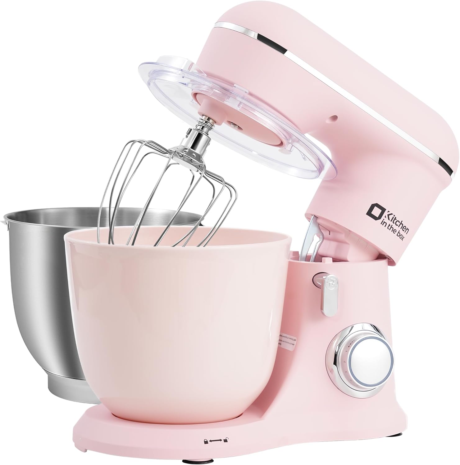 Two Mixing Bowls- Our Stand mixer equipped with 4.5QT stainless steel bowl and 5QT extra food safe plastic mixing bowls, perfect for a variety of mixing and baking needs. Special Nesting design for nest two bowls together and offer space-efficient storage.